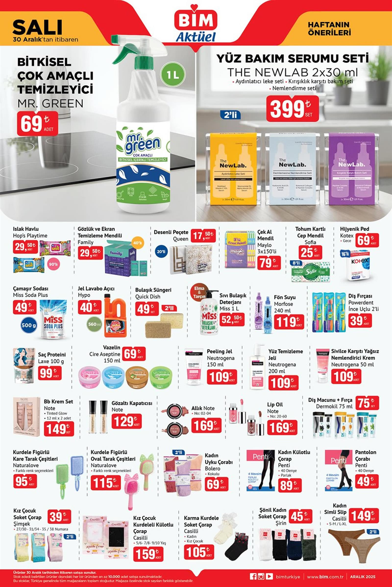 Bitkisel çok amaçlı temizleyici, yüz bakım serumu seti, ıslak havlu, desenli peçete, çek al mendil, bulaşık süngeri, çamaşır sodası, sıvı bulaşık deterjanı, diş fırçası, saç proteini ve allık gibi ürünlerin yer aldığı 30 Aralık tarihinden itibaren geçerli olacak BİM kataloğu yayınlandı.