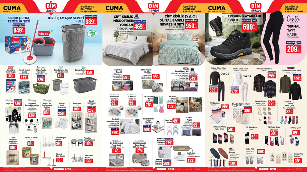 Klasik vakumlu çelik termos, krep tava, bambu standlı baharatlık seti, çift kişilik mikrofiber yorgan, kaydırmaz tabanlık, banyo paspası, banyo paspas seti, el havlusu, çift kişilik lastikli penye çarşaf ve ayakkabı gibi ürünlerin yer aldığı 9 Ocak tarihinden itibaren geçerli olacak BİM kataloğu yayınlandı.